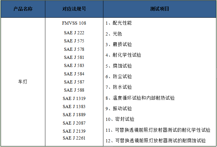 美国交通部下属国家公路安全局规定:为保障驾驶安全,在美国市场出售的车辆灯具及其附件,必须要通过当地的车灯DOT认证,同时在产品上刻印相应的DOT标志,否则不能销售且会被海关查扣。DOT是英文简写,美国交通部英文全称(Department of Transportation)。一般常见的车灯包括前照灯(远近光)、位置灯、转向灯、日行灯、前雾灯、倒车灯、刹车灯、牌照灯、反射器等。