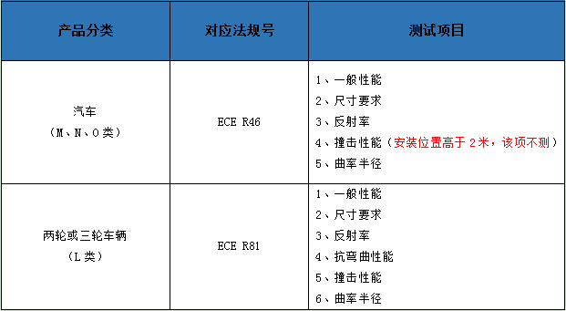 根据ECE Regulation要求,后视镜在出口至欧洲市场的时候,必须通过后视镜E-mark认证,并在产品上标注E标志,否则会被海关扣押以及被进口国市场监督管理机构处罚。需要通过后视镜E-mark认证的后视镜包括内视镜与外后视镜,适用的车型包括两轮摩托车、电动车、三轮车、客车、货车、拖挂车等。